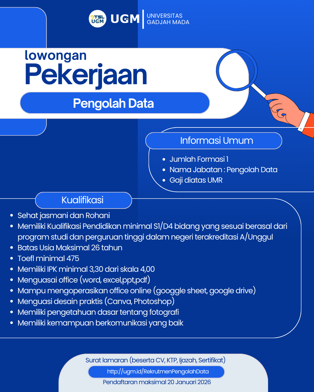 1. Pelamar wajib melakukan pendaftaran melalui laman : http://ugm.id/RekrutmenPengolahData
